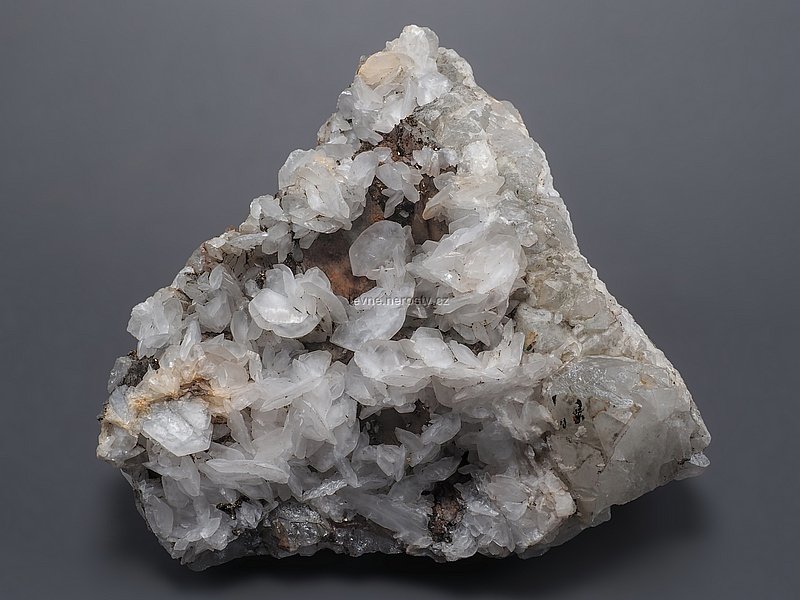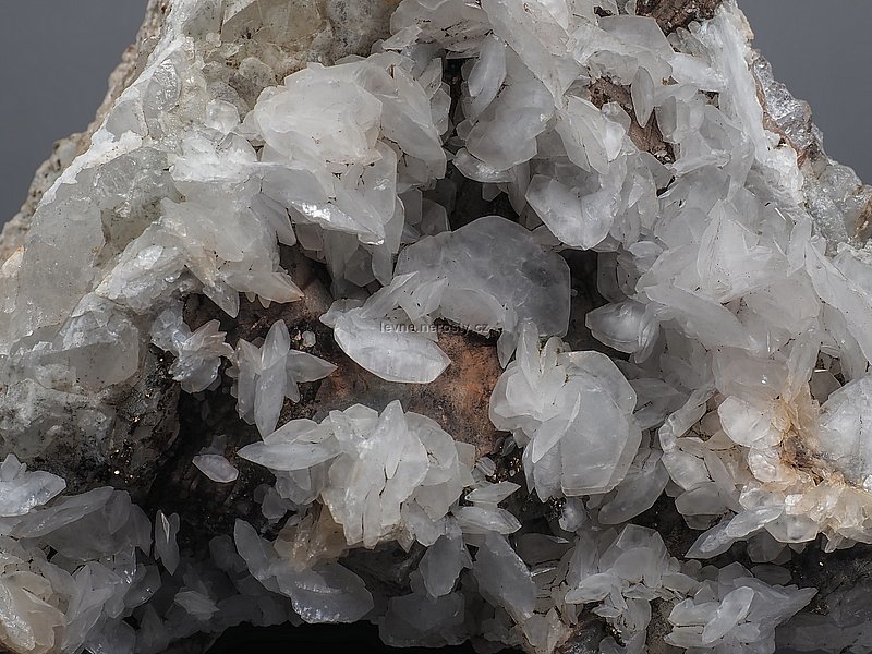 Lupenité kalcitové krystaly na křemenné žilovině s příměsí fluoritu. |