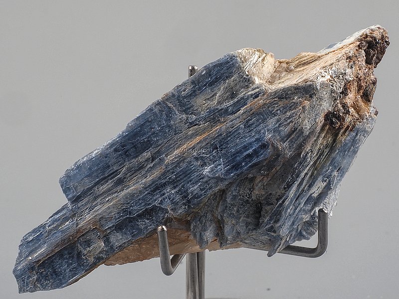 Světle modré až šedomodré lišty kyanitu v křemeni. |