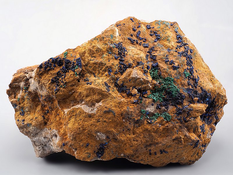 Krystalky azuritu a malachitu narostlé na prokřemenělé podložce. |